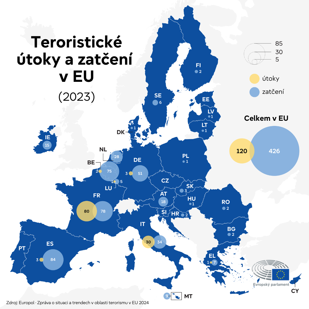 Terorismus v EU: vývoj situace, teroristické útoky a počet zatčení v roce 2023